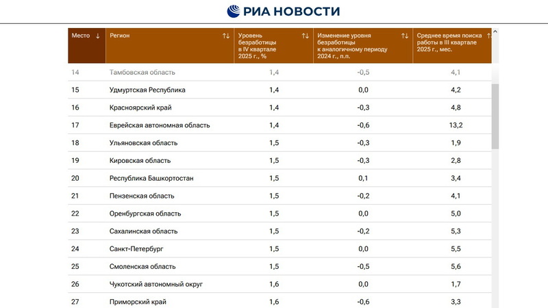 Самый низкий уровень безработицы в четвертом квартале 2025 года отмечался в Москве — 0,8%. Для сравнения в Оренбурге — 1,5% (столько же было и год назад). Последнюю строчку рейтинга занимает Ингушетия с 25,5%.