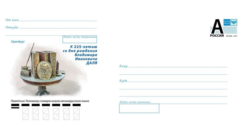 Среди городов, претендовавших на увековечивание памяти Владимира Даля на почтовом конверте, были Луганск и Москва. Однако решающую роль сыграл необычный памятник, установленный у входа в Оренбургскую областную библиотеку им. Крупской на ул. Советской. В областном центре в бронзе увековечили детище всей жизни Даля – «Словарь живого великорусского языка».