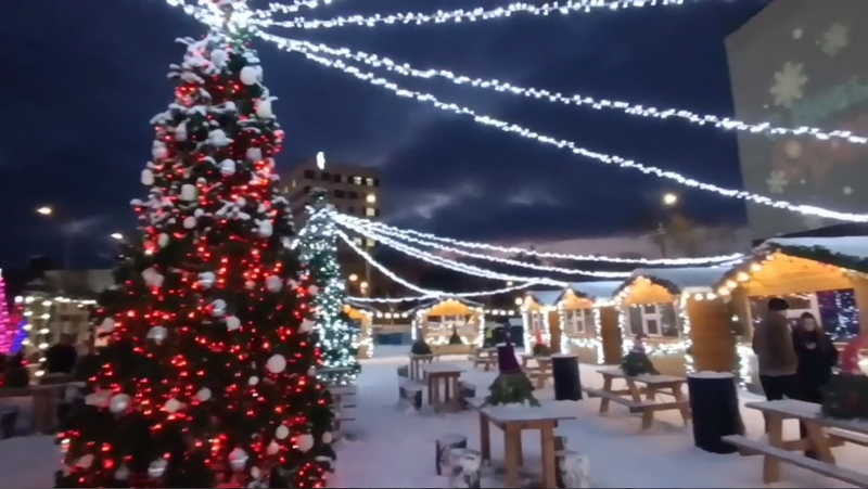 На площади им. Ленина оренбуржцы могут покататься на коньках и с горки. Согреться горячими напитками и перекусить горожане могут в маркете еды. На территории городка и возле Дома Советов установлено десять домиков с продукцией местных предпринимателей.